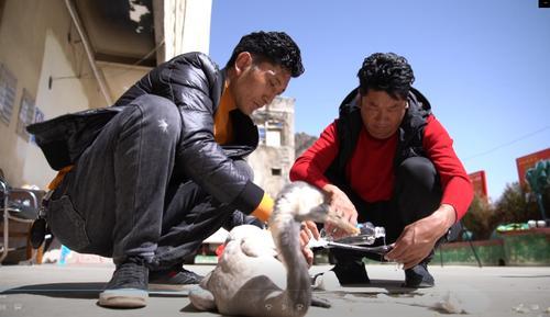 工作人員西巴鄧鄧正在和同事一起為一只受傷的灰鶴包扎換藥。